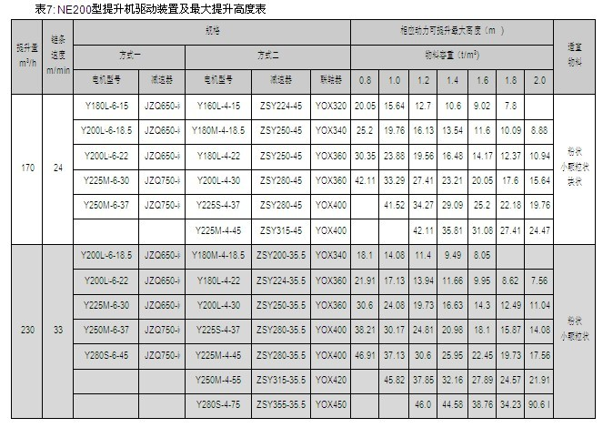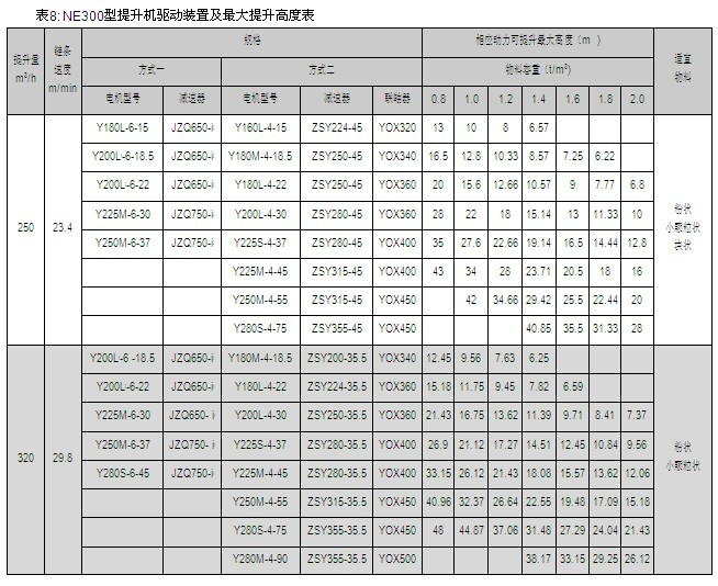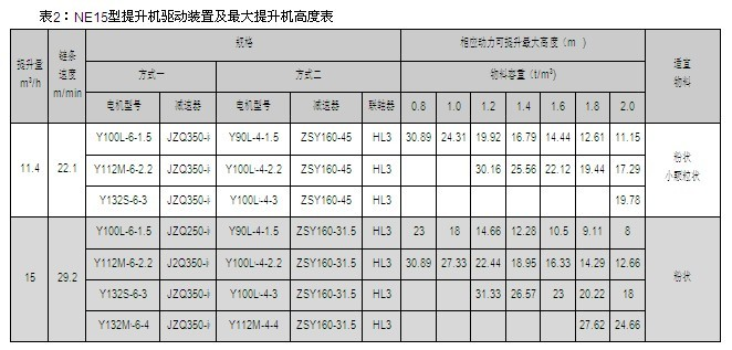 NE15、NE30、NE50、NE100、NE150、NE200、NE300、NE400型提升機(jī)的提升量上限、提升高度上限及動(dòng)力配備表見表2~9,選擇NE500、NE600、NE800型提升機(jī)時(shí),請(qǐng)與本公司技術(shù)部聯(lián)系。