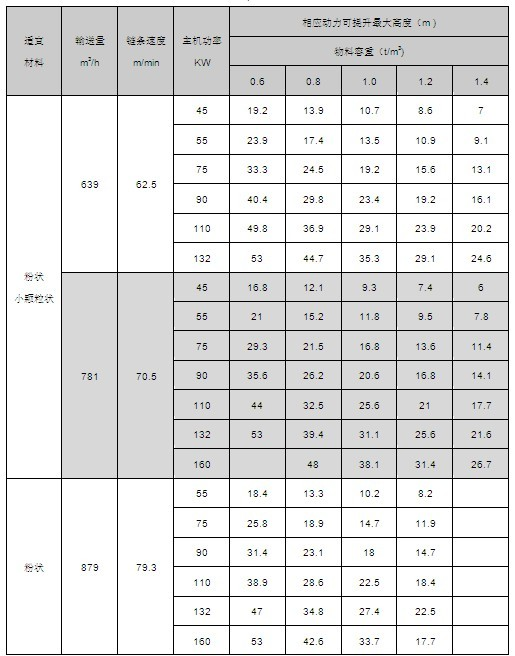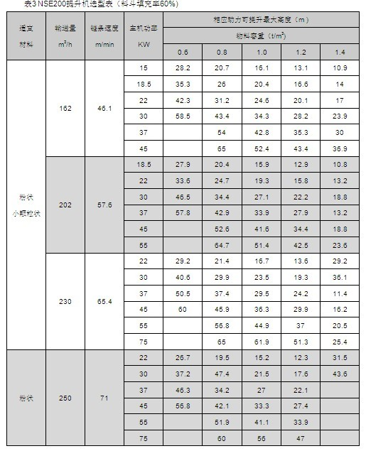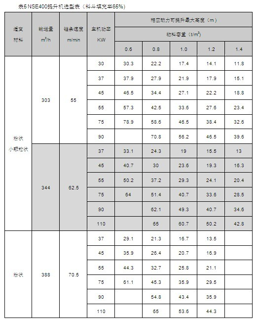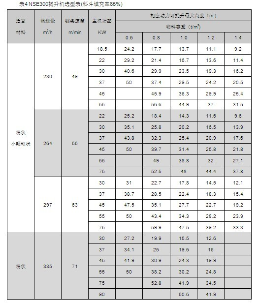 NSE系列高速板鏈斗式提升機(jī)共有九種基本型號:NSE100、NSE200、NSE300、NSE400、NSE500、NSE600、NSE700、NSE800、NSE1000,每種型號根據(jù)輸送物料的不同,選擇不同的提升速度,提升速度上限<70m/min,提升高度上限65m。另外,奧普公司還可根據(jù)用戶要求輸送量介于上述型號之間的擴(kuò)展型號。